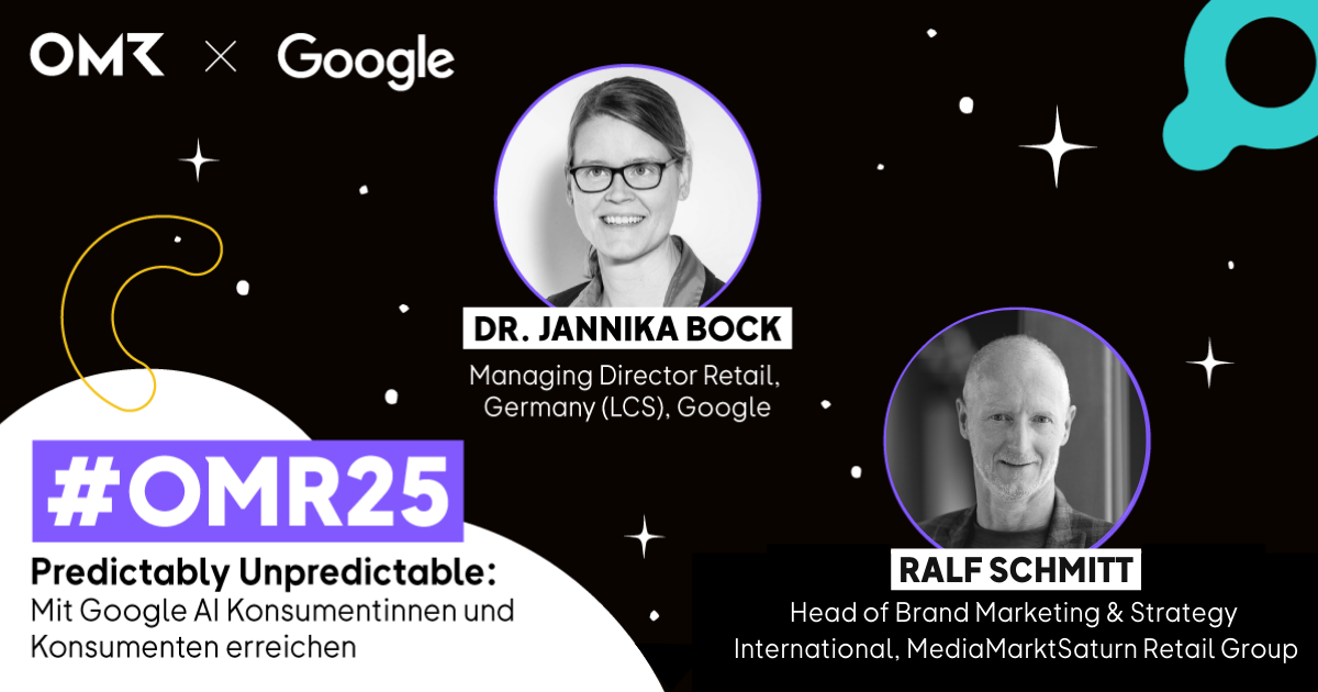 Das Konsumentenverhalten ist heute nur schwer vorherzusehen. Kaufinteressierte wechseln nahtlos zwischen Suchen, Streamen, Scrollen und Shoppen. Erfahre von Dr. Jannika Bock, Managing Director Retail, Germany (LCS) bei Google, und Ralf Schmitt, Head of Brand Marketing & Strategy International der MediaMarktSaturn Retail Group, wie du mit Googles KI-basierten Tools genau diese 'Predictably Unpredictable' Customer Journey meisterst und deine Kund*innen zu jeder Zeit erfolgreich erreichst. Hier gibt's alle Infos zu diesem Slot.