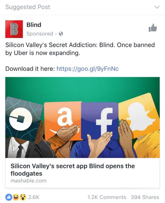 Eine Facebook-Anzeige des US-Startups Blind, die auf einen Artikel über Blind bei Mashable verweist (Quelle: Buzzfeed)
