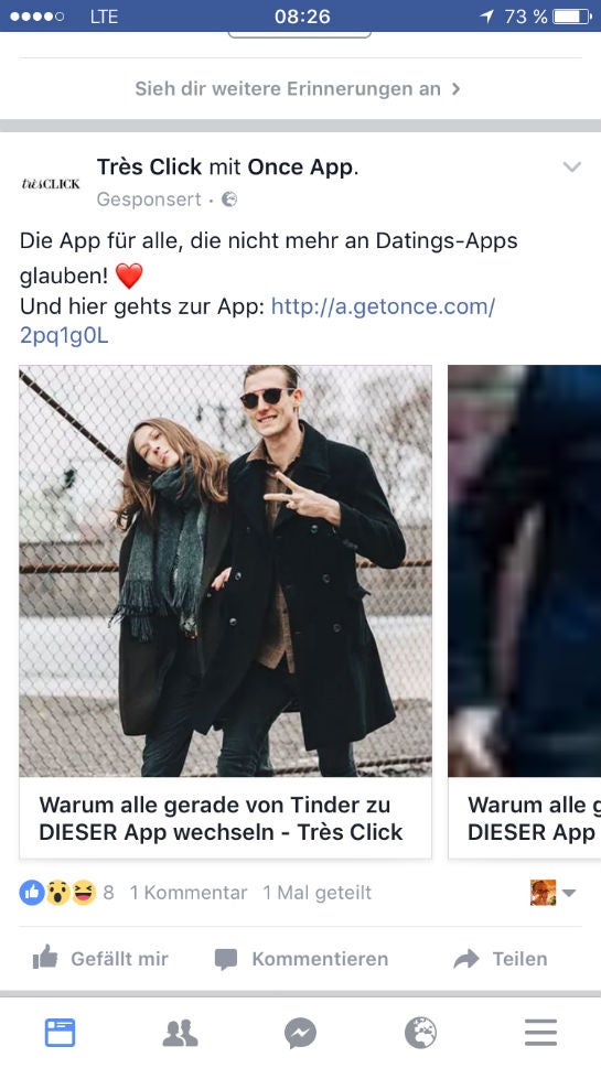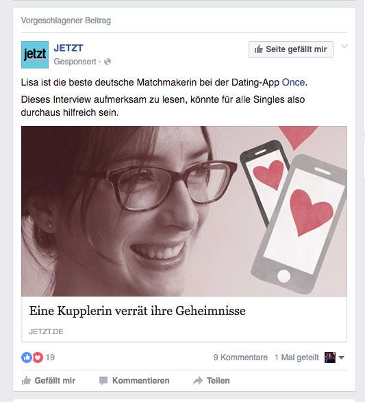 Facebook-Nutzern, die sich in ihrem Profil nicht ausdrücklich als verheiratet oder liiert ausweisen, ist möglicherweise in den vergangenen Monaten in ihrem Newsfeed eine Anzeige des Modemagazins Elle ausgespielt worden. Der Sponsored Post bewarb einen Elle-Artikel über die Dating-App Once. Once will sich als „Slow-Dating-App“ von Casual-Dating-Anbietern absetzen. Die Nutzer bekommen nur einmal am Tag eine angeblich von menschlichen „Matchmakern“ zusammengestellte Auswahl potenzieller Partner vorgestellt. „Vergesst Tinder und Co.! Diese neue Dating-App verändert ALLES…“, heißt es im Text der Elle-Anzeige.