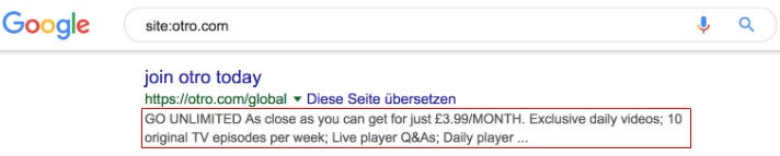 Offenbar will Otro ebenfalls in starkem Maße auf Bewegtbild setzen. Darauf lassen sich Hinweise in den Metadaten einzelner Seiten auf Otros Website finden. Wer über Google nach „site:otro.com“ sucht, dem werden alle Seiten angezeigt, die Google von dieser Domain indexiert hat. Bei einigen der Suchresultate heißt es in den Metadaten (grob übersetzt): „Unbegrenzter Zugriff für £3.99 im Monat. Exklusive tägliche Videos und zehn TV-Folgen in Erstaustrahlung. Live-Fragestunden mit Spielern…“