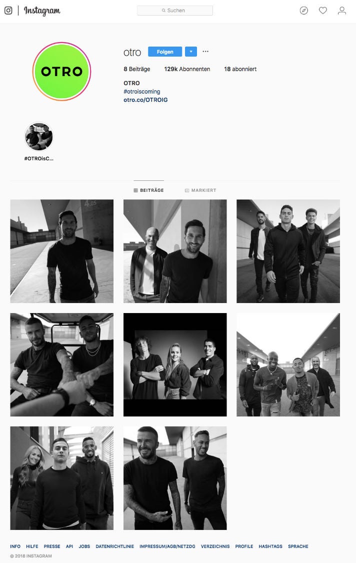 Neymar, Lionel Messi, David Beckham, James Rodriguez, Luis Suarez, Paulo Dybala, Zinedine Zidane, David Luiz, Isco, Gabriel Jesus, Jerome Boateng, Dele Alli, Romelu Lukaku, Benjamin Mendy, Lieke Martens, Eric Cantona, Toni Duggan – das ist die beeindruckende Liste aller Fußballer, die seit wenigen Stunden auf ihren Social-Media-Profilen für ein Unternehmen namens Otro werben (sortiert nach der Zahl der Instagram-Follower).
