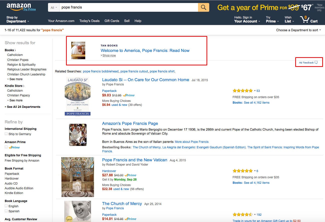 Anzeige auf amazon.com zum Keyword „pope francis“.