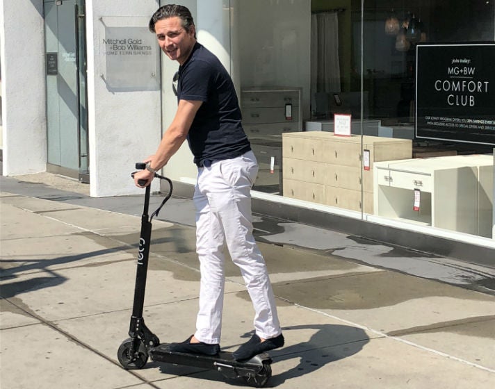 Mypostcard-Gründer Oliver Kray mit dem Fortbewegungsmittel seiner Wahl für New York: einem E-Scooter.