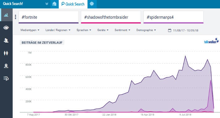 Trotzdem ist beachtlich, in welchem Maß es den beiden Firmen gemeinsam mit dem verantwortlichen Gaming-Publisher Insomniac Games gelungen ist, über die Grenzen der Gaming-Szene hinaus Aufmerksamkeit für ihr neues Produkt zu generieren. Eine exklusiv für OMR erstellte Analyse der Social-Media-Monitoring-Plattform Talkwalker legt nahe, dass das neue Spider-Man-Spiel sogar fast in die Sphären des derzeit größten Spiels der Welt vorgedrungen ist: Fortnite (hier ein ausführlicher OMR-Artikel über das Phänomen Fortnite). So sind laut der Talkwalker-Auswertung auf Twitter und Instagram innerhalb der vergangenen Tage etwas über 500.000 Posts mit dem Hashtag #spidermanps4 abgesetzt worden, von Fortnite waren es im gleichen Zeitraum etwas über 700.000. Das ist auch insofern erstaunlich, als dass Fortnite für eine Vielzahl von Betriebssystemen und Plattformen verfügbar ist, und Spider-Man nur für die Playstation 4.