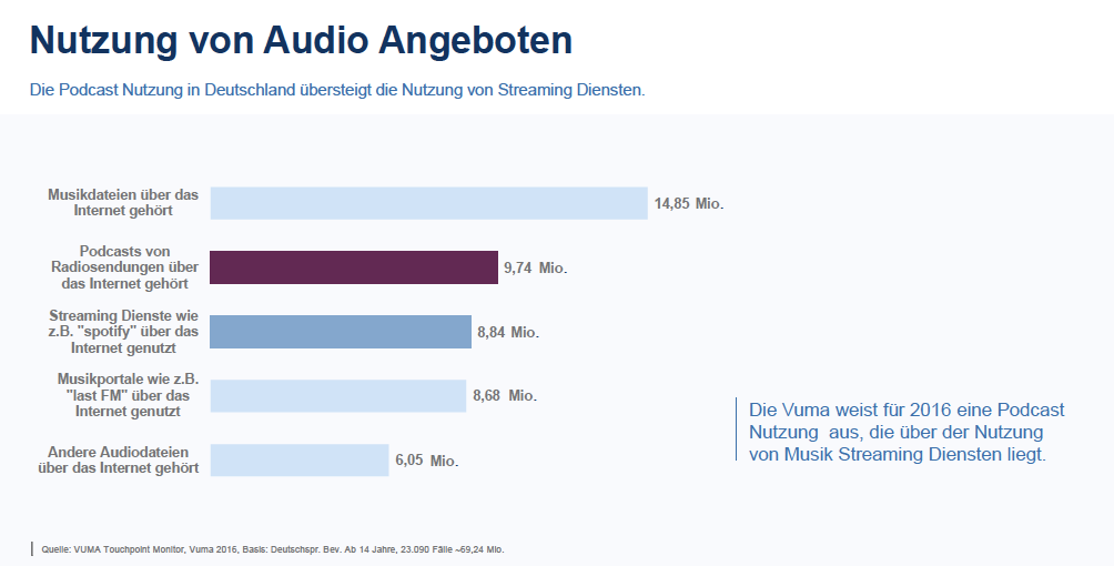 Statistik zur Podcast-Nutzung in Deutschland. Klick zum Vergrößern. (Quelle: Vuma Touchpoints Monitor)