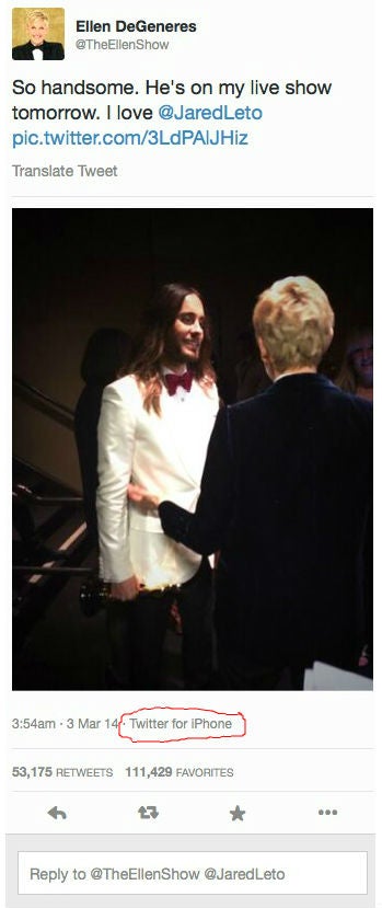 Für Samsung war das ein gelungener PR-Coup. Mittlerweile jedoch hat der Blog Slate herausgefunden, dass DeGeneres offenbar nur in der Gegenwart von Kameras ein Gerät des Sponsors benutzen wollte. Denn wer die Tweets der Moderatorin mit einer Software wie Tweetdeck oder Tweetbot aufruft, erkennt, dass sie hinter der Bühne mit einem iPhone twitterte.