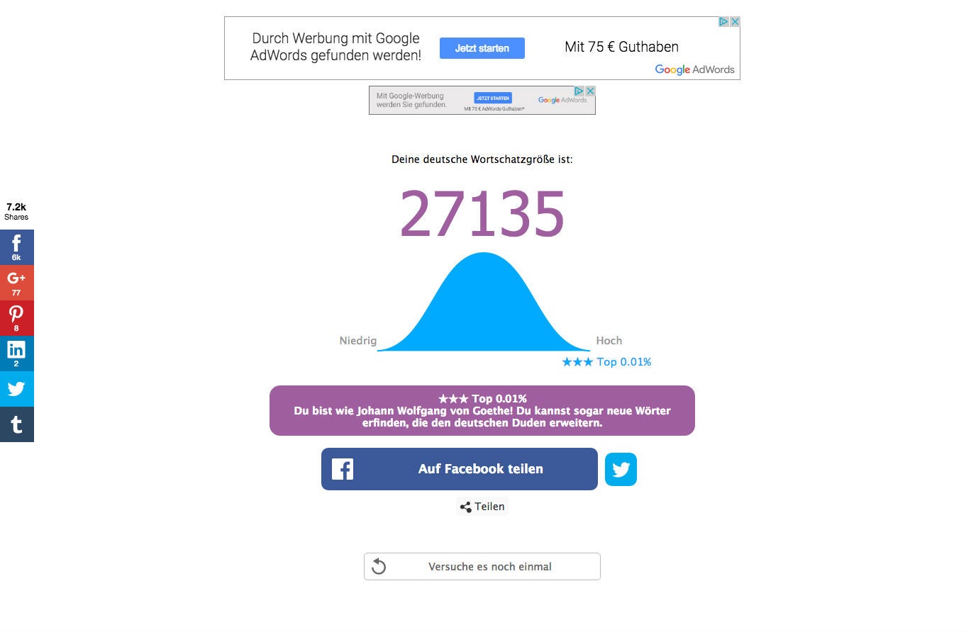 Insgesamt 50 Fragen umfasst der „Online Test zur deutschen Wortschatzgröße“ von arealme.com, der sich in den letzten Tagen vor allem auf Facebook verbreitet hat. Der Nutzer muss abwechselnd das passende Synonym beziehungsweise Antonym zu vorgegebenen Wörtern aus jeweils vier Lösungsvorschlägen wählen. Abschließend wird angeblich ausgewertet, wie groß der deutsche Wortschatz des Spielers ist. 27.135 war das in unserem Fall, damit gehören wir laut arealme.com zu den besten 0,01 Prozent: „Du bist wie Johann Wolfgang von Goethe! Du kannst sogar neue Wörter erfinden, die den deutschen Duden erweitern.“