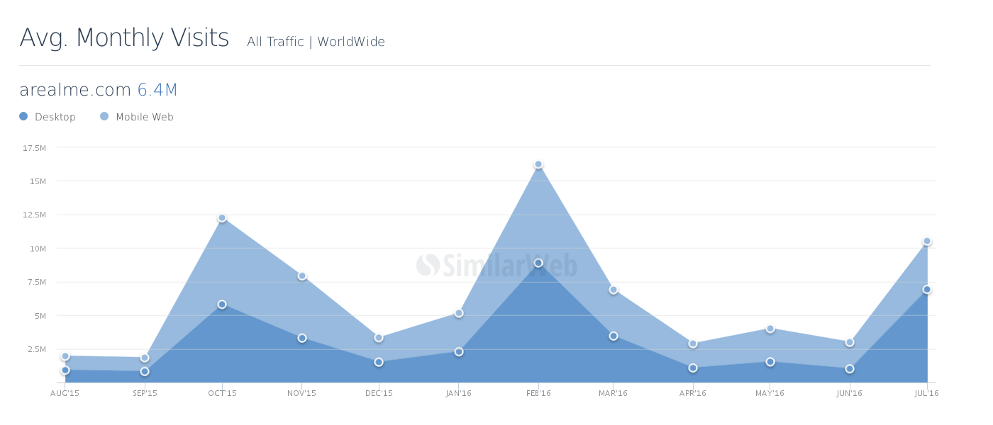 Laut Daten des Statistikdienstes SimilarWeb konnte arealme.com im letzten halben Jahr im Durchschnitt 7,3 Millionen Visits pro Monat verzeichnen; zuletzt sollen es im Juli 10,6 Millionen Seitenbesuche gewesen sein. Der Löwenanteil des Traffics kommt demnach mit 30,51 Prozent aus den USA, gefolgt von Taiwan und Japan mit 6,6 Prozent, sowie Großbritannien mit 5,5 Prozent. Deutschland befindet sich mit 0,72 Prozent auf Platz 23, für das letzte halbe Jahr wären das im Schnitt rund 50.000 Visits pro Monat. Der wichtigste Kanal zur Traffic-Akquise ist laut SimilarWeb mit über 65 Prozent Social und davon zu 90 Prozent Facebook. Rund 17 Prozent stammen von SEO, zwölf Prozent sollen direkte Type-Ins sein.