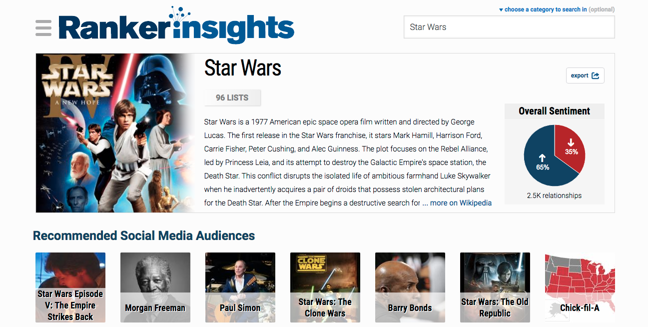 Im April 2017 launcht Ranker dann eine eigene Audience-Insights-Plattform. EContentMag beschreibt diese Plattform mit dem Namen Ranker Insights folgendermaßen: “Ranker Insights ermöglicht es Marketern und Media Buyern, psychographische Insights der Zielgruppe zu erhalten. Des Weiteren erlaubt es den Werbetreibenden, andernfalls nicht einsehbare Beziehungen zwischen User-Präferenzen einzusehen.” Somit greift Ranker nun auch eigenen Kunden wie Filmstudios, Plattenlabels, etc. mit ihren Insights aktiv unter die Arme, macht eine Art Agentur-Job und erschließt für sich einen neuen Geschäftszweig.