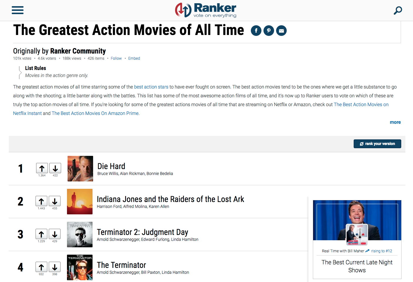 Laut Quantcast kann Ranker.com rund 75 Millionen Visits im Monat vorweisen. Ranker.com beschäftigt sich, wie bereits angesprochen, mit Listicles – einer Mischform von Listen und Artikeln, die zu einem großen Teil von BuzzFeed geprägt wurden. Unter diesen Listicles auf Ranker finden sich manch skurrile Themen, wie zum Beispiel “50 Stupid Signs Made to Protect Idiots from Themselves”, “The Worst Flavors Ever” oder “Bald Head Tattoos You Have To See”.