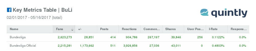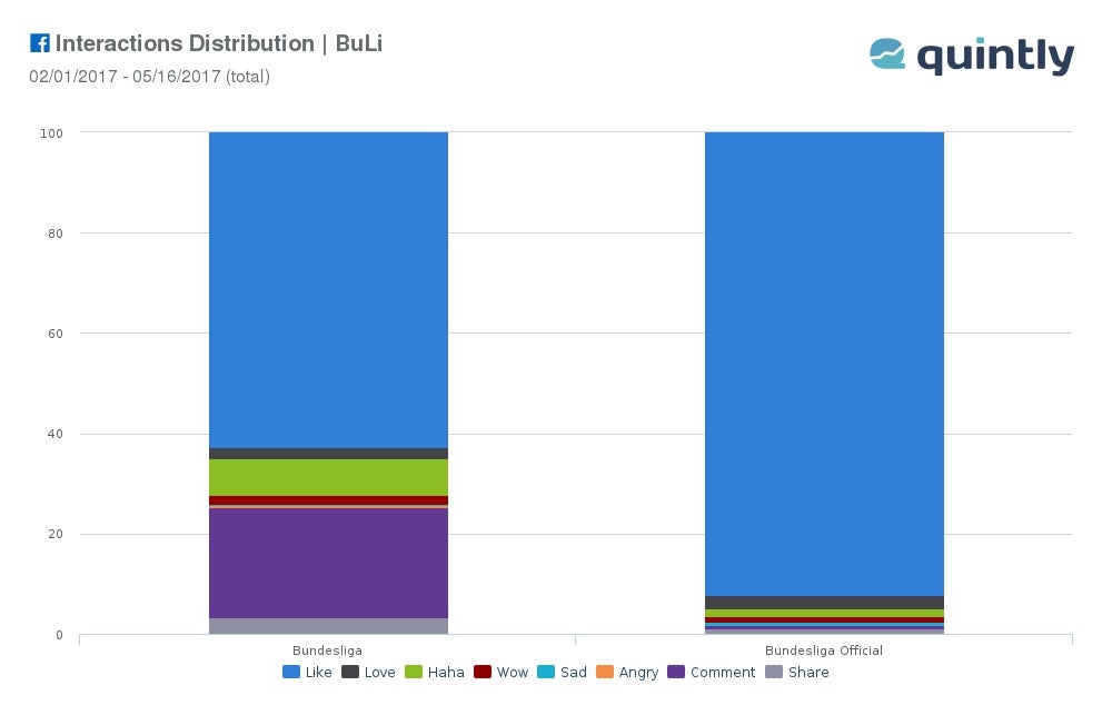 Interaktionsarten der offiziellen Bundesliga-Facebook-Seite im Vergleich mit der von Raphael Brinkert (Quelle: quintly.com)