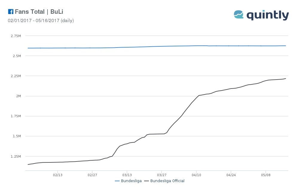 Fan-Entwicklung der offiziellen Bundesliga-Facebook-Seite im Vergleich mit der von Raphael Brinkert (Quelle: quintly.com)