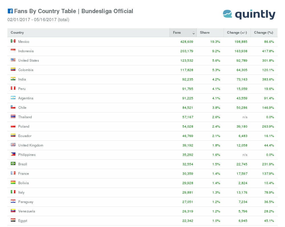 Aus diesen Ländern stammen die meisten Fans der offiziellen Bundesliga-Facebook-Seite (Quelle: quintly.com).