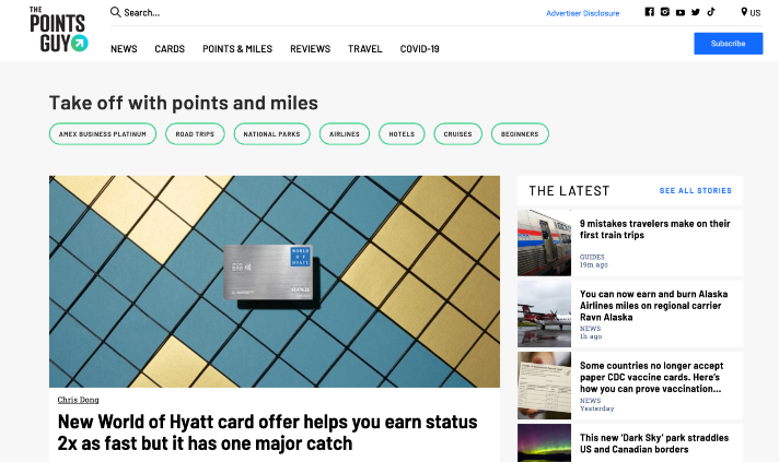 Wie das geht, zeigt zum Beispiel „The Points Guy“. Der Reiseblog gehört mittlerweile zu Red Ventures und ist vor allem für eines bekannt: Kreditkartenempfehlungen auf Grundlage von Bonusmeilen großer Fluglinien. Wir hatten schon 2017 über den Affiliate-Publisher geschrieben, der an neuen Kreditkarten-Kund:innen jeweils bis zu 300 US-Dollar verdient.