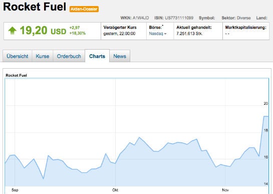 Die Real-Time-Bidding-Plattform Rocket Fuel rutschte direkt nach der gestrigen Veröffentlichung der Zahlen für das dritte Quartal auf den dritten Platz unseres Portfolios. Nach Abzug der Kosten für den Traffic-Einkauf konnte der Umsatz um 64 Prozent auf 59,1 Millionen Euro gesteigert werden. Stärkster Wachstumstreiber waren Mobile, Social und Video, die zusammen ein Umsatzwachstum von 177 Prozent erreichten. Für unser Portfolio bedeutet das ein starkes Plus von 36,10 Prozent oder 3.614,68 Euro. Trotz der aktuellen Entwicklung liegt Rocket Fuel immer noch zehn US-Dollar unter dem Ausgabekurs.