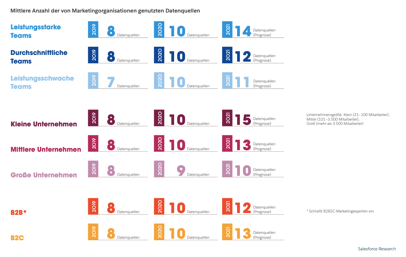 Neben den Länderprofilen werden außerdem 14 Branchen in jeweils eigenen Profilen aufgeschlüsselt. Und am Ende des Reports werden noch einmal alle Erkenntnisse zusammengefasst. Eine davon: Die von Marketing-Teams genutzten Datenquellen nehmen immer weiter zu. Im Durchschnitt kamen alleine von 2019 auf 2020 zwei neue Quellen dazu, unabhängig von Unternehmensgröße oder Leistungsstärke der Teams. Für den B2B-Bereich bedeutet das zum Beispiel, 2020 zehn Quellen auswerten zu müssen, statt acht. Das kann, je nach vorheriger Auslastung und Art und Weise, die Daten zu analysieren, schnell zu einer großen Herausforderung werden.