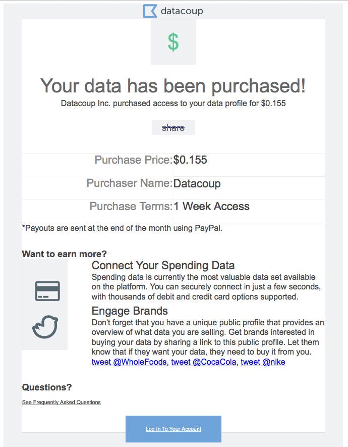 Alle von den Nutzern gesammelten Informationen wandern laut Datacoup-FAQ in einen Datenpool. Laut Unternehmen werden aus den Datensätzen alle Elemente, durch die die Nutzer persönlich zu identifizieren sind, entfernt.