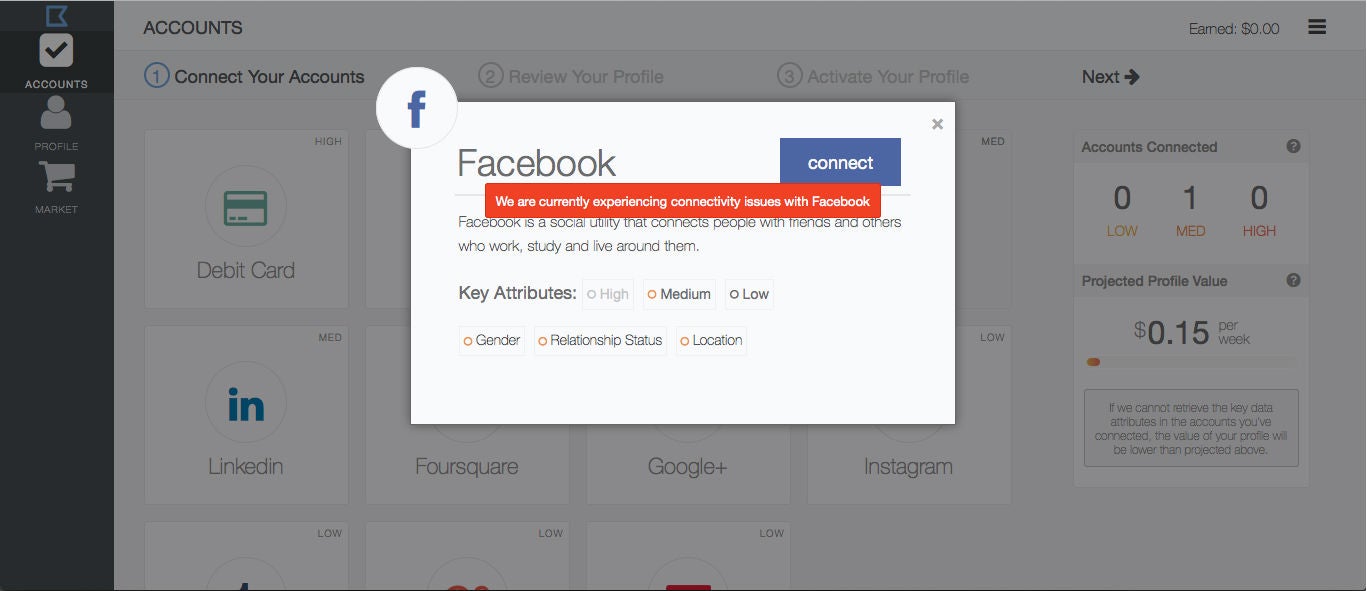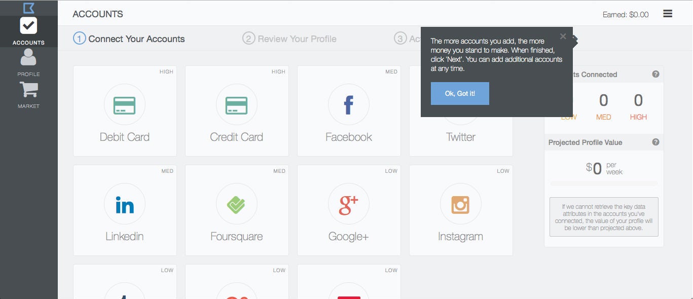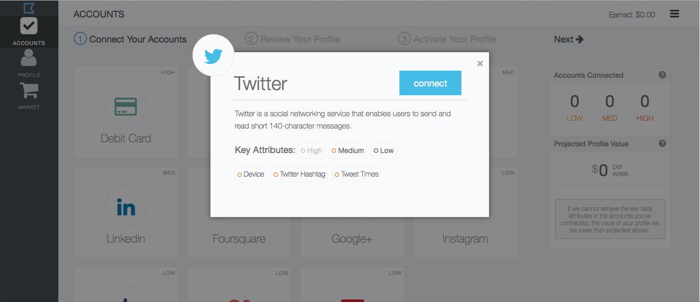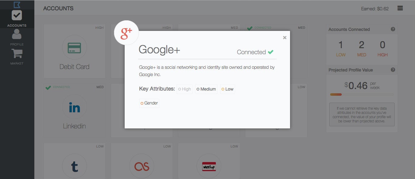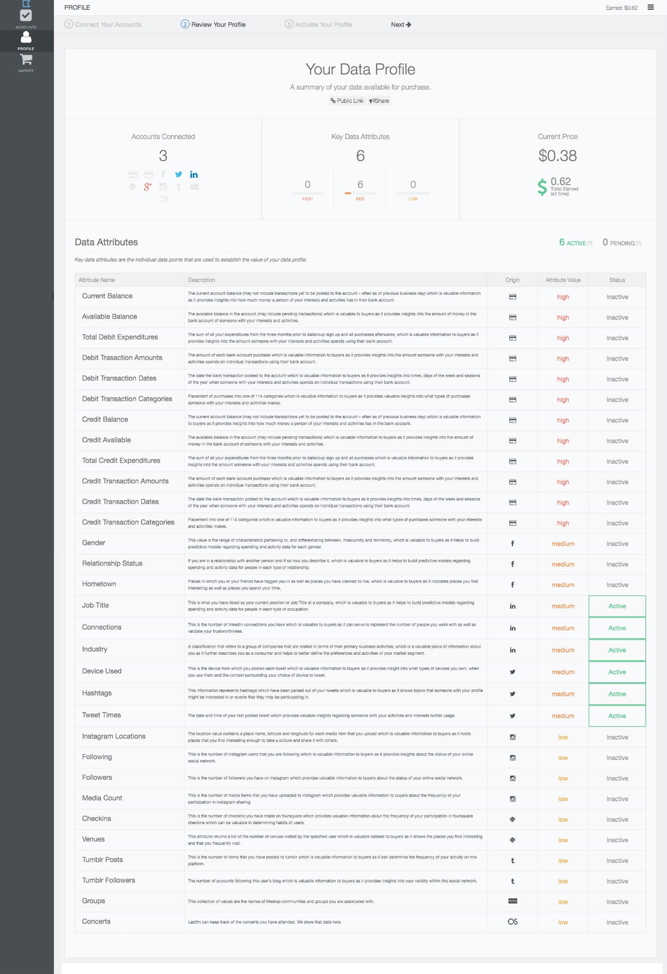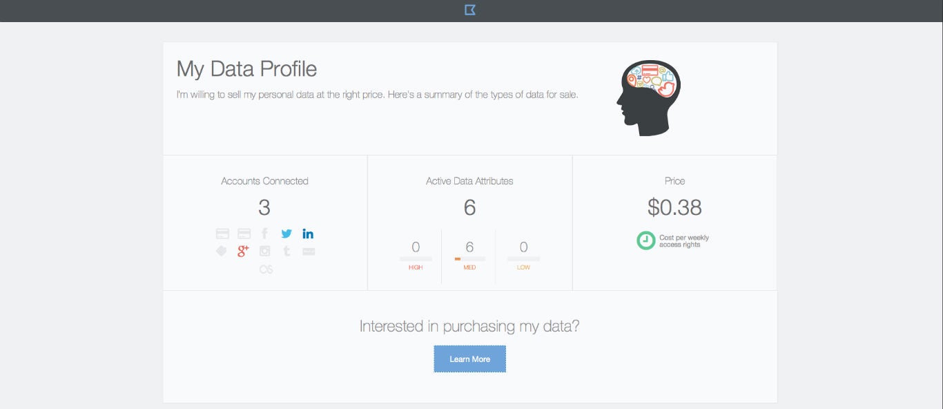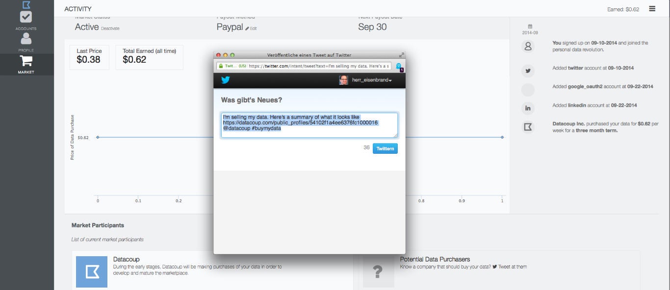 Über die US-Plattform Datacoup soll es möglich sein, mit dem Verkauf der eigenen Daten monatlich rund acht US-Dollar zu verdienen – auch wenn sich das Unternehmen auf die genaue Summe nicht längerfristig festlegen lassen will. Ich habe mich bei Datacoup registriert. Nachdem ich der Plattform den Zugriff auf Daten aus meinem Google-Plus-, LinkedIn- und Twitter-Profil erlaubt habe, bezifferte Datacoup den Wert meines Nutzerprofils auf 38 US-Cent (bezogen auf wöchentliche Zugriffsrechte). Während eines Tests im Februar dieses Jahres sollen laut einem Artikel des US-Wirtschaftsmagazins „Forbes“ 1.500 Teilnehmer durchschnittlich etwa 1,56 US-Dollar mit Datacoup verdient haben. Das Geld zahlte offensichtlich Datacoup selbst: Bis dahin hatten noch keine Werbetreibenden Daten von den Plattformbetreibern gekauft, heißt es bis „Technology Review“.