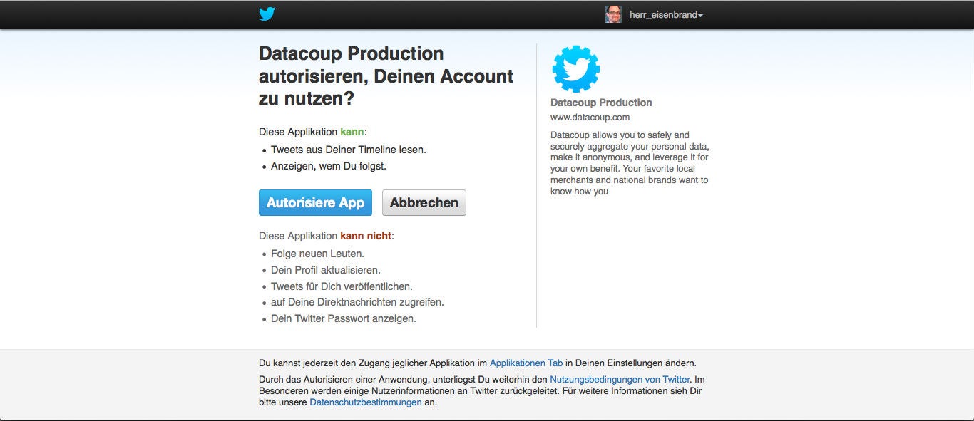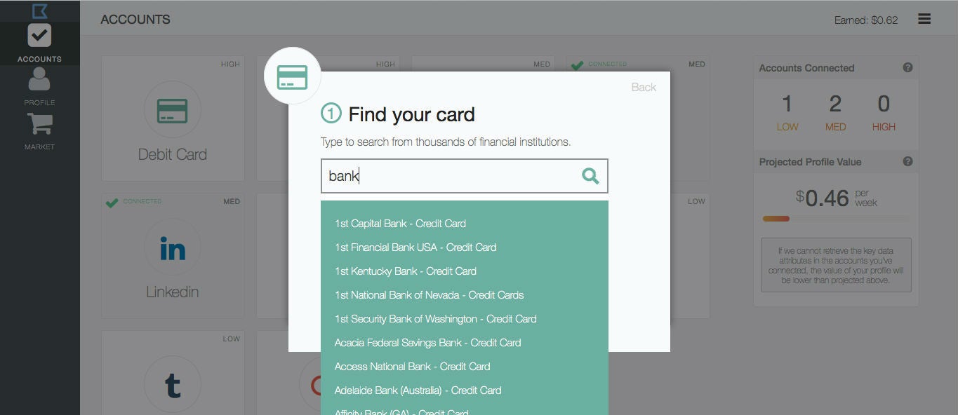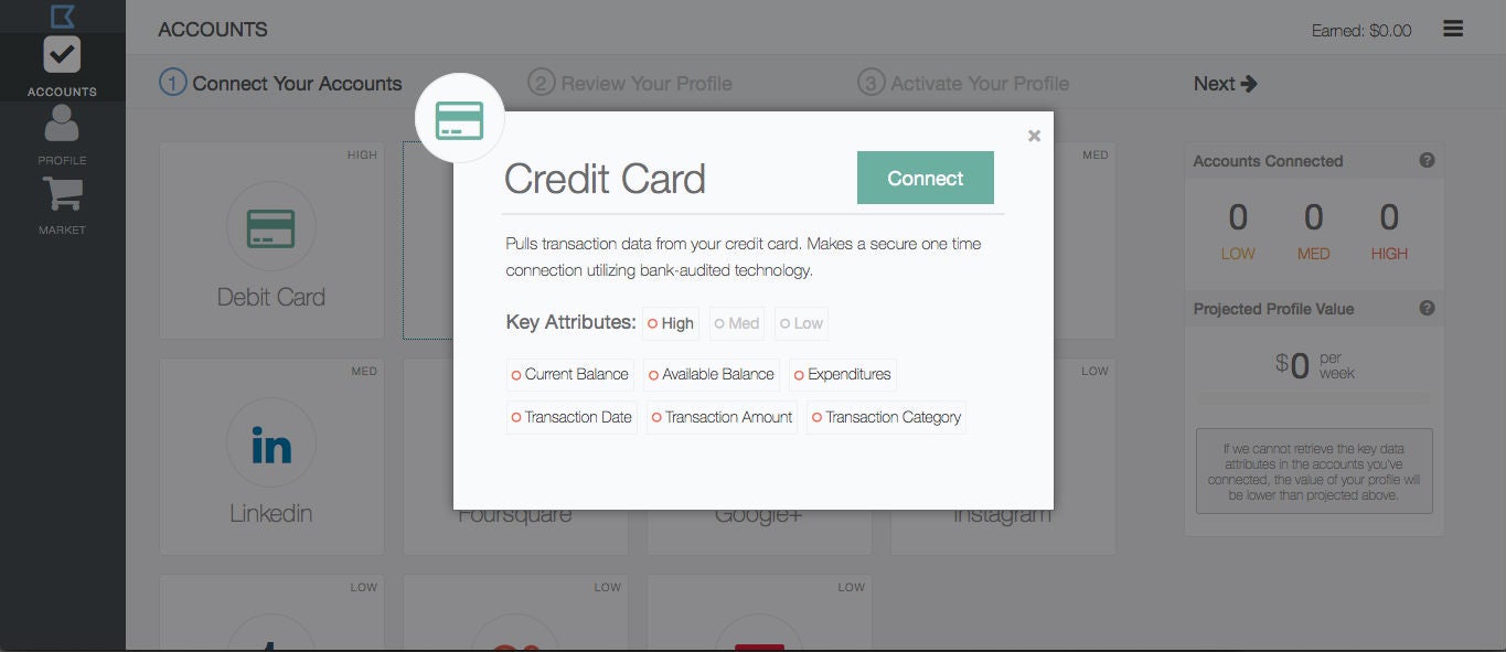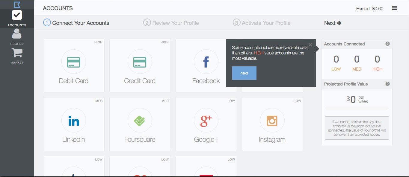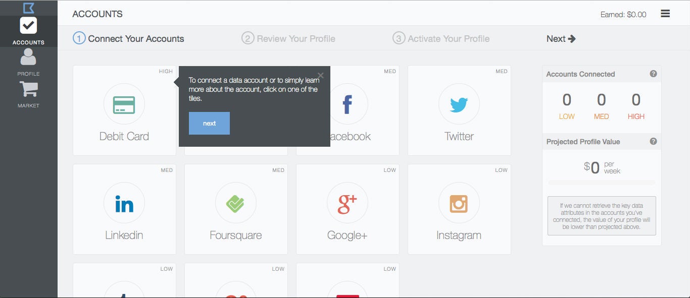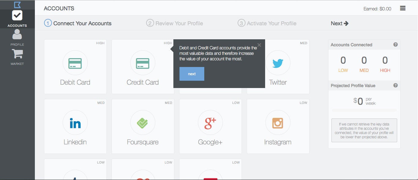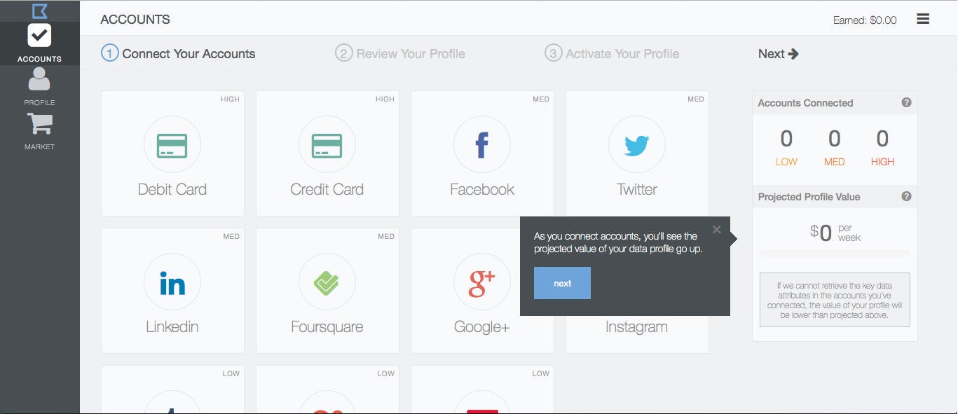 Über die US-Plattform Datacoup soll es möglich sein, mit dem Verkauf der eigenen Daten monatlich rund acht US-Dollar zu verdienen – auch wenn sich das Unternehmen auf die genaue Summe nicht längerfristig festlegen lassen will. Ich habe mich bei Datacoup registriert. Nachdem ich der Plattform den Zugriff auf Daten aus meinem Google-Plus-, LinkedIn- und Twitter-Profil erlaubt habe, bezifferte Datacoup den Wert meines Nutzerprofils auf 38 US-Cent (bezogen auf wöchentliche Zugriffsrechte). Während eines Tests im Februar dieses Jahres sollen laut einem Artikel des US-Wirtschaftsmagazins „Forbes“ 1.500 Teilnehmer durchschnittlich etwa 1,56 US-Dollar mit Datacoup verdient haben. Das Geld zahlte offensichtlich Datacoup selbst: Bis dahin hatten noch keine Werbetreibenden Daten von den Plattformbetreibern gekauft, heißt es bis „Technology Review“.