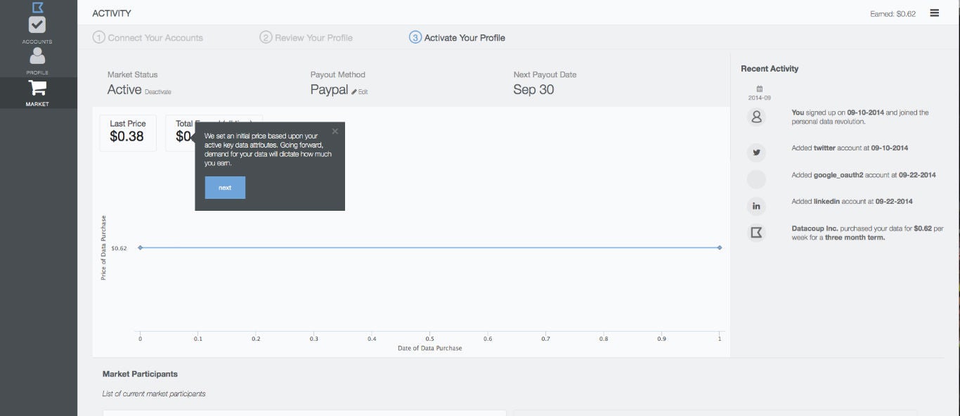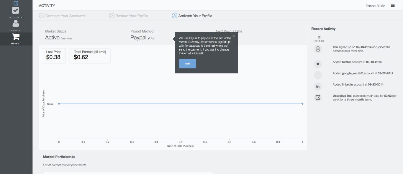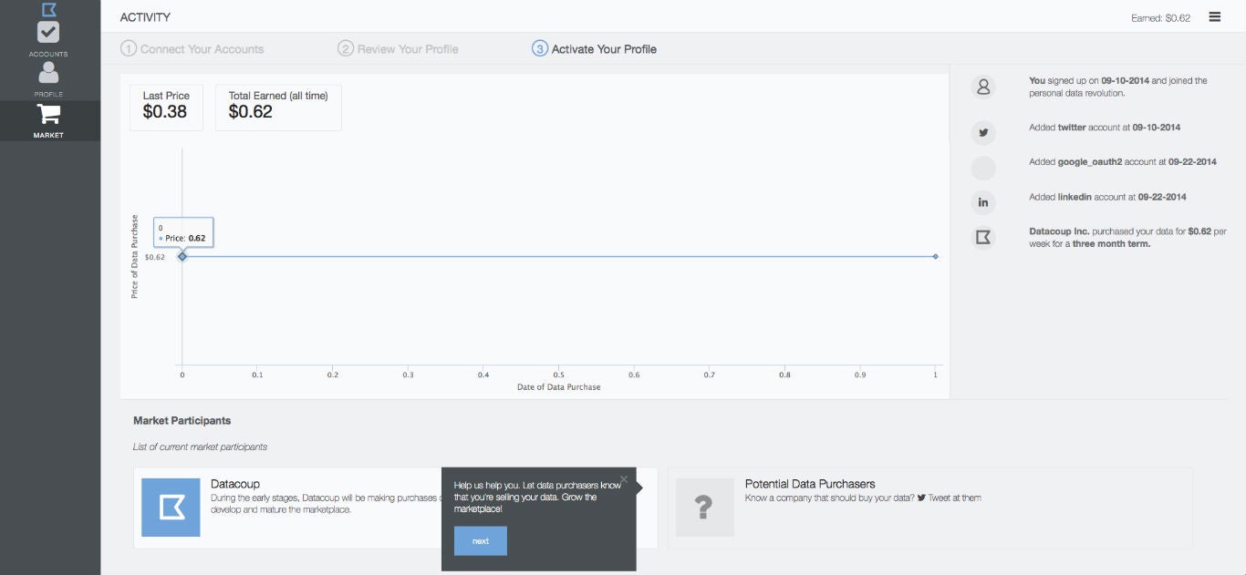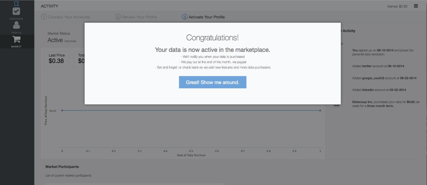 Wir haben uns angemeldet – klickt Euch durch die Gallerie, um Euch anzuschauen, was die Datacoup-Nutzer nach dem Login erwartet (Fortsetzung des Artikels unterhalb der Gallerie):