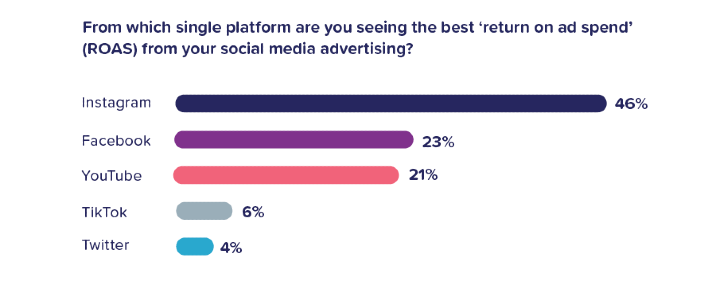 Der erste große Trend ist das erwartete weitere Wachstum der Ausgaben auf Instagram. Schon jetzt schalten 94 Prozent der Befragten Ads auf der Plattform – da ist also nicht mehr viel Spielraum. Nach 26 Prozent im Vorjahr geben jetzt bereits 44 Prozent der Marketing-Verantwortlichen an, auf Instagram den Großteil des Social-Ad-Budgets auszugeben. Und 46 Prozent sehen hier auch den größten Return on Invest (ROI). Instagram ist in beiden Statistiken der klare Gewinner. Dementsprechend wollen 73 Prozent der Befragten ihre Spendings auf der Plattform weiter erhöhen – im vergangenen Jahr hatten das nur 38 Prozent angegeben.