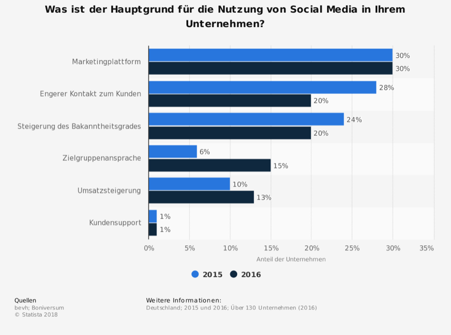 Laut Statista gewann Social Media für Unternehmen schon in den Jahren 2015 und 2016 zunehmend an Relevanz, befragt wurden rund 130 Unternehmen (Quelle: Statista).
