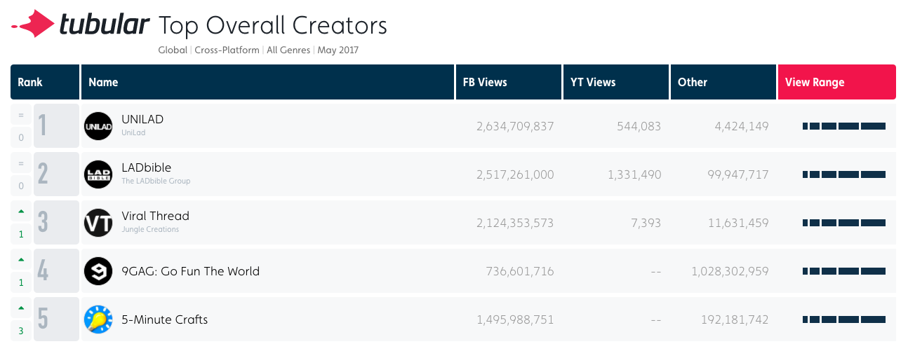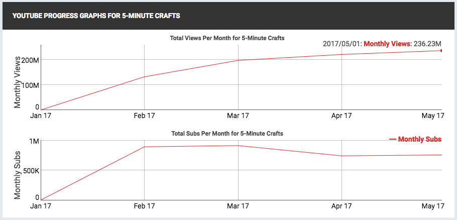 Wer sich die Videos des Youtube-Kanals “5-Minute Crafts” genauer anschaut, wird ein interessantes Detail entdecken: Alle Clips werden in einem quadratischen Format hochgeladen – unüblich für Googles Video-Plattform, aber trotzdem einfach zu erklären. Die Macher des Channels nutzen Youtube allem Anschein nach ausschließlich zur Zweitverwertung; alle Inhalte werden zuerst auf der gleichnamigen Facebook-Seite veröffentlicht. Und die wartet mit nicht minder beeindruckenden Zahlen auf: 31,7 Millionen Fans (Stand: 22. Juni 2017) haben laut dem Statistik-Dienstleister Tubular Labs dafür gesorgt, dass “5-Minute Crafts” mit rund 1,5 Milliarden Video-Views im Mai 2017 auf Platz 5 der reichweitenstärksten Video-Creator gelandet ist. Da in dieser plattformübergreifenden Auswertung die Aufrufe des Youtube-Kanals anders als bei Teilen der Konkurrenz offenbar nicht berücksichtigt wurden (siehe Screenshot), könnte es für “5-Minute Crafts” sogar auch für den vierten Platz gereicht haben.
