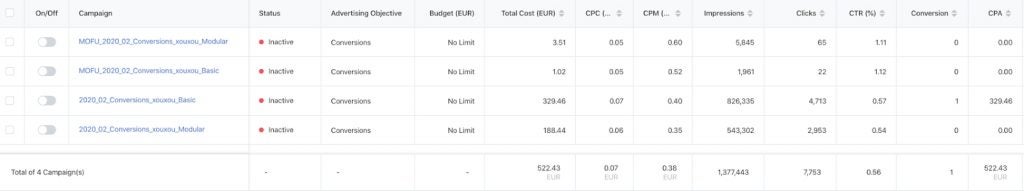 Nun gut, lasst uns direkt ans Eingemachte gehen: Welche Zahlen und Ergebnisse könnt Ihr bei TikTok erwarten? Um Euch einmal einen Eindruck zu vermitteln (und den Beweis zu liefern, dass das alles an den Haaren herbeigezogen ist), folgend ein Screenshot von vier von uns umgesetzten Kampagnen, die auf Conversions ausgelegt waren. Der erste Screenshot zeigt den Kampagnen-Level.