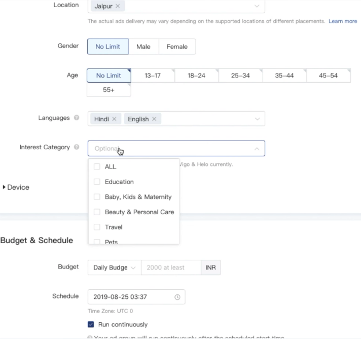 Die Auswahlmöglichkeiten bei der Budgetierung der Kampagne, hier in der Währung indische Rupien (Quelle: Dinesh Jangid)