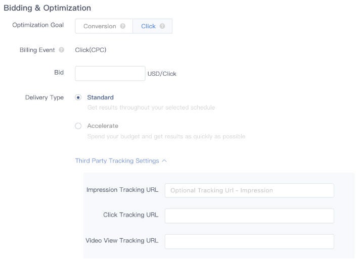Im nächsten Schritt müssen die Tiktok-Werbekunden auswählen, auf Basis welcher Metrik sie auf das Werbeinventar bieten und optimieren möchten. Zur Auswahl stehen laut Tiktok-Website CPC (Cost-per-Click), CPM (Cost-per-Mille, entspricht dem deutschen Tausender-Kontakt-Preis, steht jedoch offenbar nicht für Tiktok selbst zur Verfügung) sowie „oCPC“. Hinter letzterem soll nach Unternehmensangaben eine intelligente Optimierungsmethode stehen, bei der die Kunden pro Klick zahlen, aber auf Conversions optimiert und das Gebot entsprechend angepasst wird.