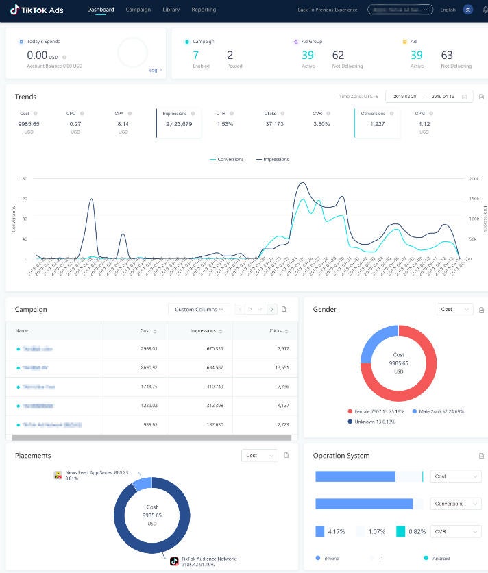 Das Dashboard von Tiktoks Buchungs-Tool (Quelle: Tiktok)