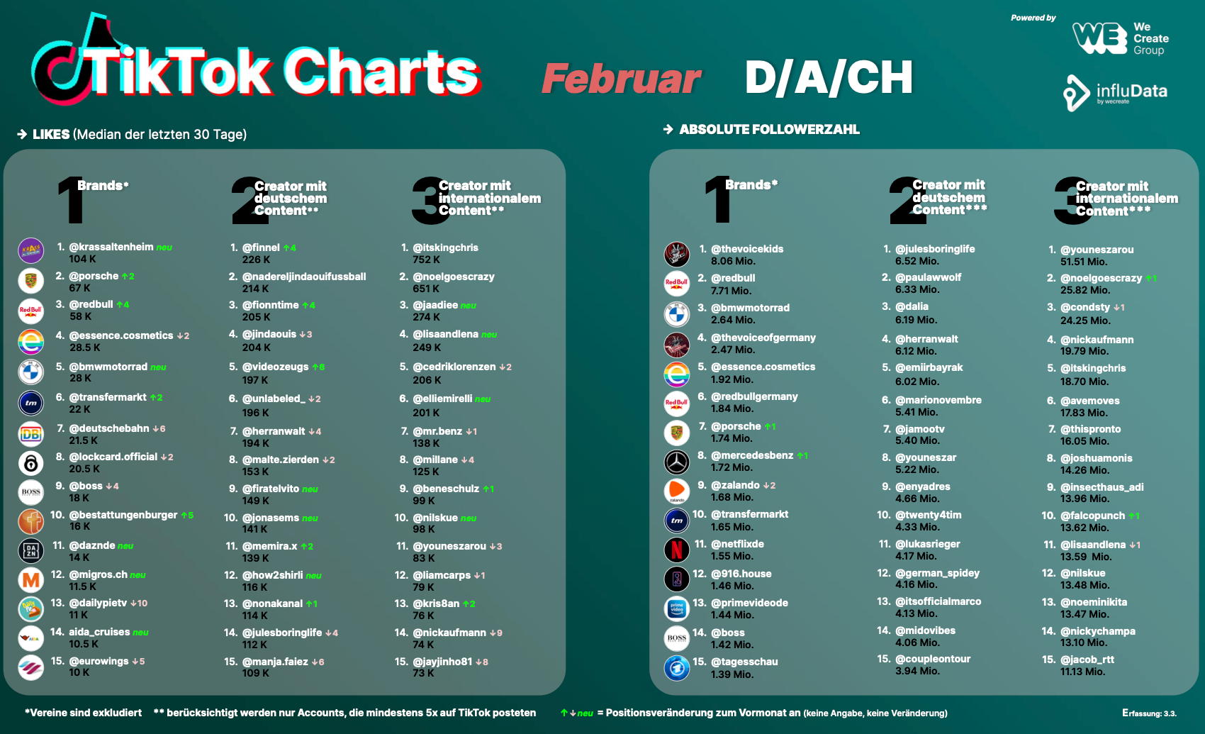 Das gesamte von Wecreate mit Infludata erstellte Ranking der erfolgreichsten Tiktok Accounts im Februar 2023 findet Ihr hier: