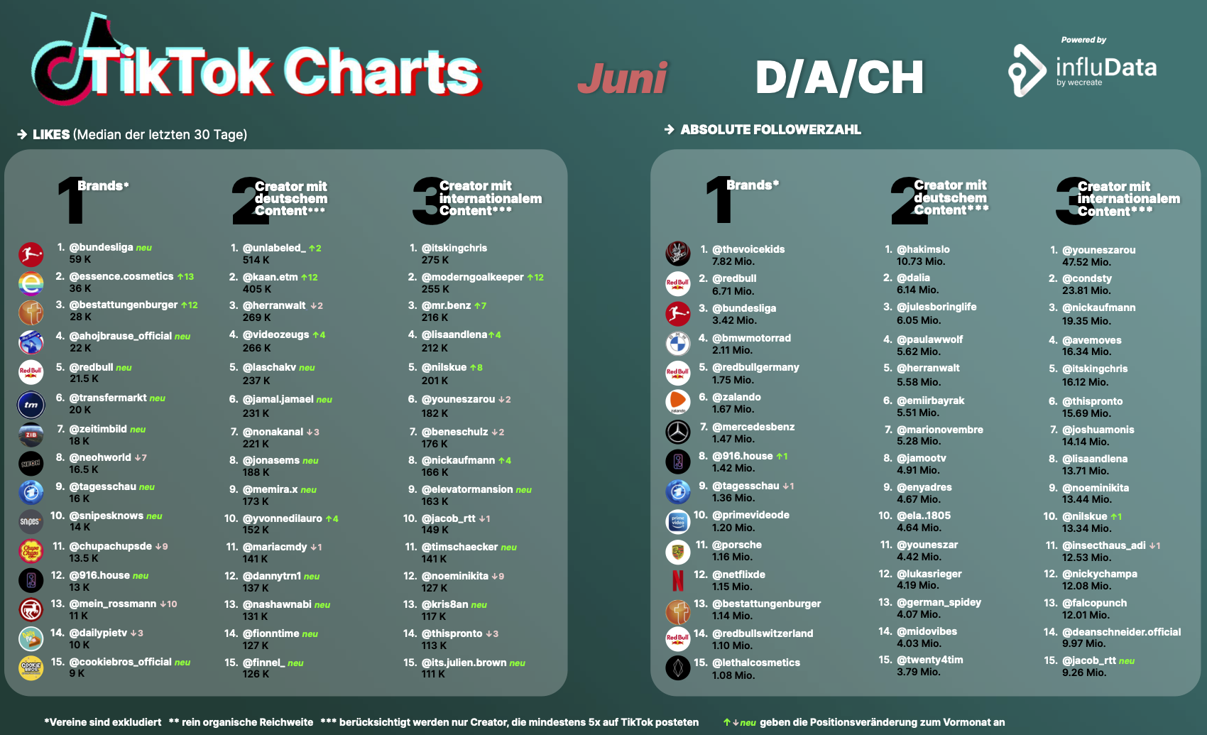 Alle Marken und zusätzlich Creator:innen, die im vergangenen Monat am meisten Likes sammeln konnten, findet Ihr im gesamten Ranking: