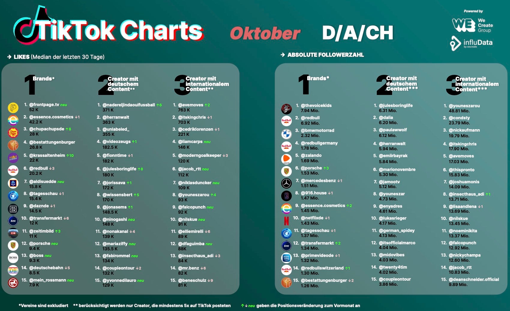 Tiktok Charts: Das waren die reichweitenstärksten Brands & Creator im Oktober 2022