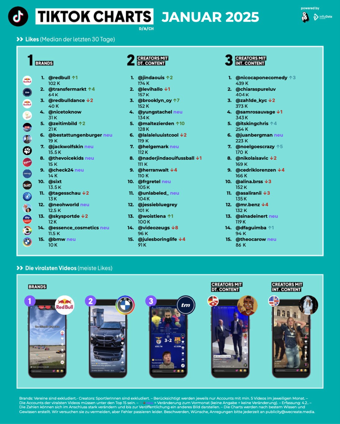 So sieht das vollständige, von Wecreate mit Infludata erstellte Ranking der erfolgreichsten Tiktok-Accounts im Januar 2025 aus: