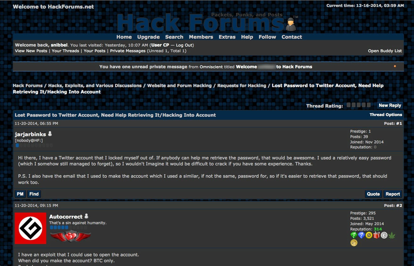 Auf HackForums.net bittet ein User die Mitglieder darum, sich in seinen Account einzuloggen; er habe das Passwort vergessen. Ein anderes Mitglied bietet ihm an, sich in das Konto einzuhacken – gegen Zahlung einer Gebühr in Bitcoins.