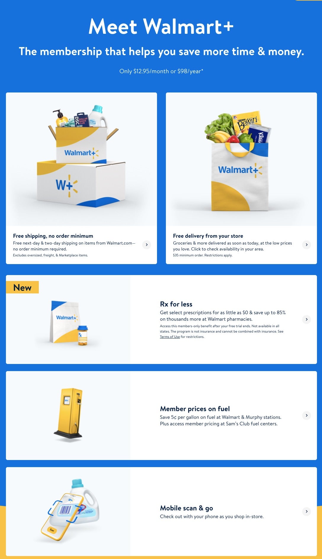Die größte Neuerung auf Kundenseite war jedoch sicherlich die Einführung von Walmart+ im Herbst 2020, einem Pendant zu Amazons Kundenbindungsprogramm Prime. Mit 98 US-Dollar Jahresgebühr ist Walmart+ rund 20 US-Dollar günstiger als Amazon Prime. Zu den Leistungen gehören kostenlose Lieferung von Artikeln auf Walmart.com, kostenlose Lieferung aus einem Laden, wenn möglich noch am selben Tag (auch Lebensmittel), sowie Rabatt auf Benzin an den Walmart-Tankstellen.