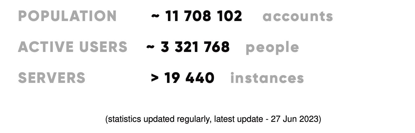 Das gesamte Fediverse soll aktuell über 11,7 Millionen Accounts mit 19.440 betriebenen Servern verzeichnen. Da die Nutzer*innen der Erhebung von Statistiken zustimmen müssen, ist nur die "Mindestzahl" der Nutzer*innen bekannt. Auf Mastodon gibt es dementsprechend Unschärfen bei der Zahl der Nutzer*innen. Nach Angaben der offiziellen Mastodon-Webseite gab es am 1. September 2023 auf allen etwa 9.000 zugänglichen Mastodon-Servern 8,07 Mio. Nutzer, von denen 1,78 Millionen monatlich aktiv waren.