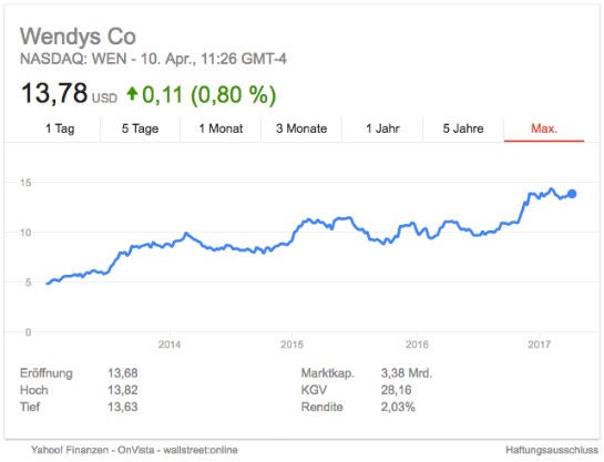 Die Entwicklung des Aktienkurses von Wendy’s (Quelle: Google)