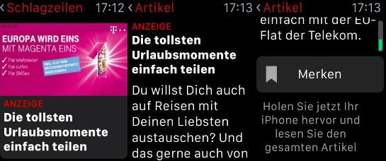 Sind Smartwatches damit als Werbemedium per se unbrauchbar? Keinesfalls, da Apple Marketern seit der zweiten Keynote im März weitreichende Werbeformen einräumt: So ist es werbetreibenden Unternehmen inzwischen möglich, interaktive Anzeigenformate zu entwickeln, die sich über das gesamte Display erstrecken – Ads direkt auf dem Homescreen des iPhones sind dagegen bis heute tabu.