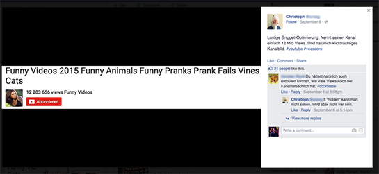 Eins können wir aber versprechen: Morgen bringen wir etwas richtig Geiles – zum Frühstück. Heute gibt es dafür noch einen witzigen Trick zum Feierabend: Unser Buddy Christoph hat mal wieder einen geilen Kniff bei Facebook gepostet: Der Youtuber WagonVideos hat nämlich seinen Kanal einfach „12 203 656 views Funny Videos“ genannt. Dazu ein klickträchtiges Profilbild und schon wirkt es, als wäre der Kanal extrem beliebt. Insgesamt kommt er laut Youtube-Informationen auf fast 1,3 Millionen Aufrufe – nicht schlecht aber weit weg von den erträumten zwölf Millionen. Andere Kanäle wie „6,969,696 views“ und 7,777,776 views“ haben sich die Taktik schon abgeguckt. Entschuldigt also, dass es heute keinen Artikel gibt. Deshalb zeigen wir nur diese extrem bauernschlaue – andere sagen streetsmarte – Youtube-Optimierung. Mehr Youtube-Tipps gibt es in unserem Report.