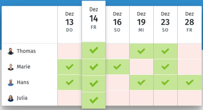 Ein typisches „Doodle“ mit vier Teilnehmern und sechs Termin-Optionen.