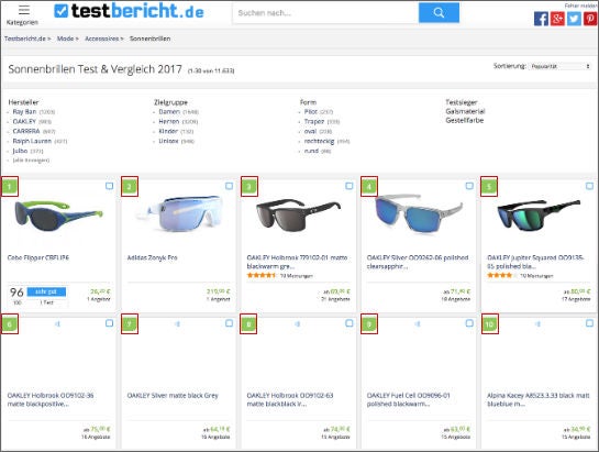Ein Ranking von Sonnenbrillen auf Testbericht.de (bearbeiteter Screenshot, Quelle)