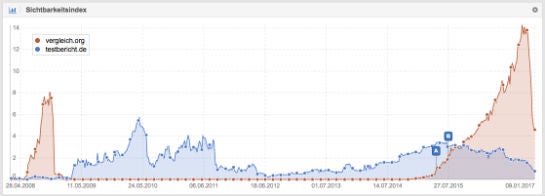 Ein Vergleich der Entwicklung der Sichtbarkeit von vergleich.org (rot) und Testbericht.de (blau) durch das SEO-Tool Sistrix