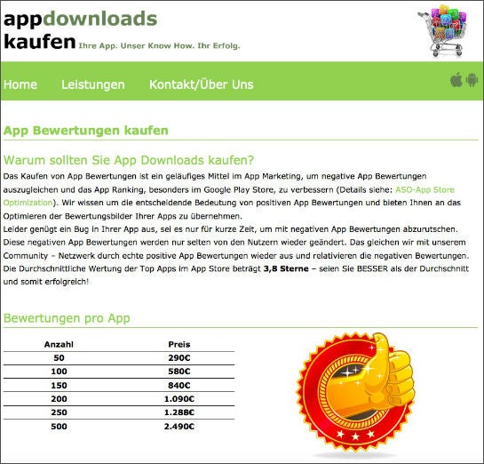 Über Google lassen sich jedoch immer noch leicht Anbieter wie AppReviewsKiosk und BestReviewApp finden, über die sich Bewertungen kaufen lassen. Auf der Minijob-Plattform Fiverr gibt es eine eigene Sektion, in der Nutzer anbieten, für Auftraggeber für schmales Geld Reviews zu verfassen.