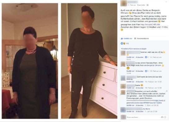 Solche Erfolgsmeldungen, inklusive Vorher-Nachher-Fotos von sich selbst, posten die Mitglieder von „Abnehmen ohne Hunger ( Low Carb nach Benni ) – Abnehmtricks & Abnehmtipps“ offenbar regelmäßig in der Facebook-Gruppe – zumindest wenn man einem Youtube-Video von Gruppenbetreiber Benjamin Oltmann glauben darf (s.u., ab 5:20). OMR wurde trotz entsprechendem Antrag die Mitgliedschaft in der Gruppe bislang nicht gewährt.