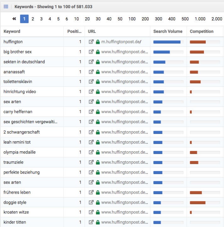 Eine Auswahl der Keywords, zu denen die Huff Post auf den vorderen Google-Plätzen vertreten ist (Quelle: Sistrix, Bearbeitung: OMR)
