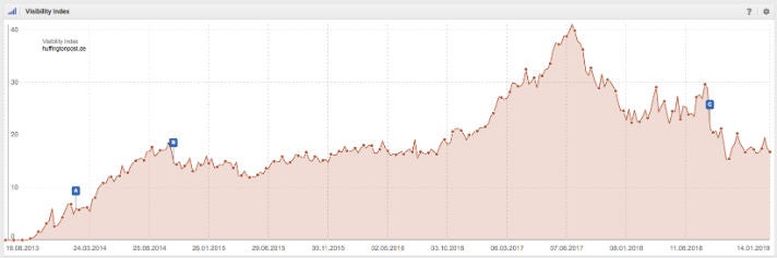 Die Entwicklung der Sichtbarkeit der deutschen Huff Post innerhalb von Googles Suchergebnissen (Quelle: Sistrix)