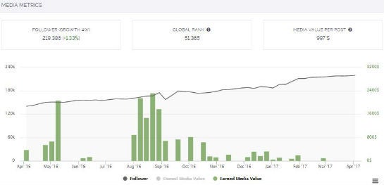 Die Entwicklung der Follower-Zahl und des „Earned Media Value“ von Scott Eddys Instagram-Account. Deutlich sichtbar: Die durch den „Insta-Purge“ verursachte Delle im September 2016. (Quelle: Influencer.db)