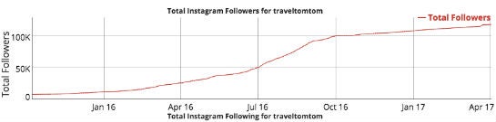 Die Follower-Entwicklung von „traveltomom“ bei Instagram – auffällig das starke Wachstum im Sommer (Quelle: Socialblade)